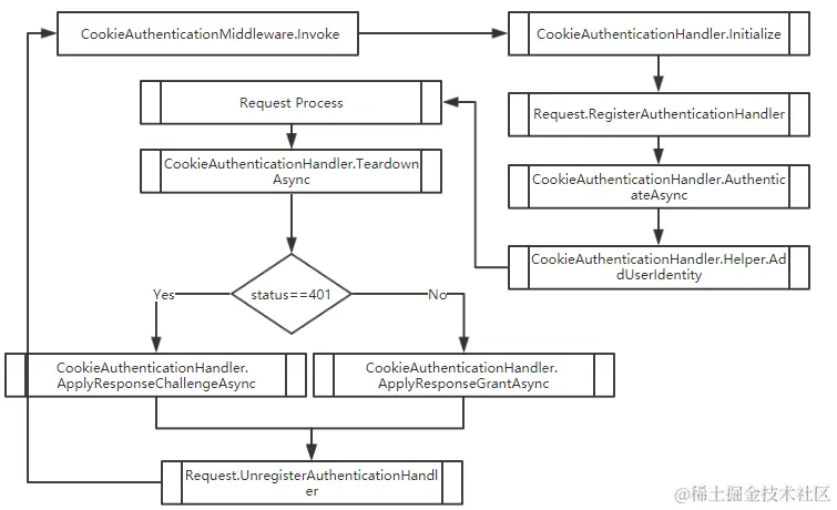 1. Cookie验证中间件默认是积极模式,所以在处理器初始化时就会调用AuthenticateAsync方法,对请求中的身份信息Cookie进行解析、验证。