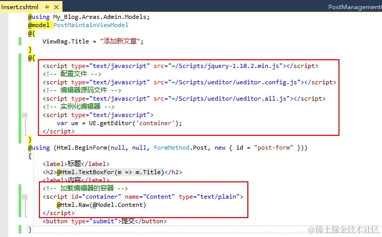 ueditor是一个百度开源的web编辑器,其功能非常强大并且还针对不同语言提供了对应的后台程序用于支持图片、文件的上传、网络图片抓取等。先下载ueditor,并将其添加到My Blog项目中的Scripts文件夹下: