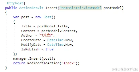ASP.NET MVC的模型绑定功能的作用是将Http请求中的数据映射到MVC的Action方法的参数上,上面介绍的内容就是利用MVC的模型绑定功能,将在HTML表单中填写的数据映射到Insert方法的PostMaintainViewModel类型参数上。