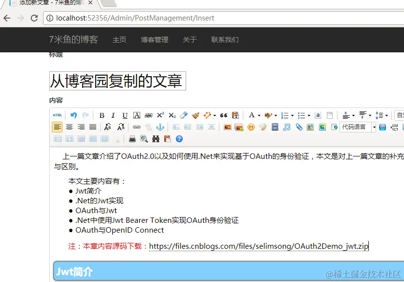 添加页面:直接复制一篇博客园的文章,粘贴到编辑器中。