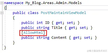 2、另外需要在PostMaintainViewModel的Content属性上加入AllowHtml特性,因为内容中包含HTML代码,验证会抛异常