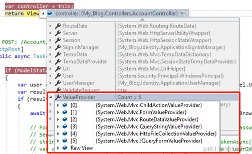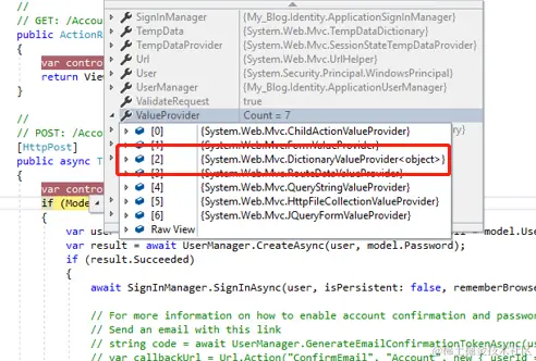 请求中的值提供器与之前的相比多了一个用于提供Json数据的DictionaryValueProvider<object>类型: