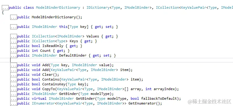 所有的ModelBinder都被一个名为ModelBinderDictionary的字典进行管理,而这个字典就存在于Controller类型的定义中,如下图所示,它是一个被保护的内部属性,用于Controller执行时完成模型绑定: