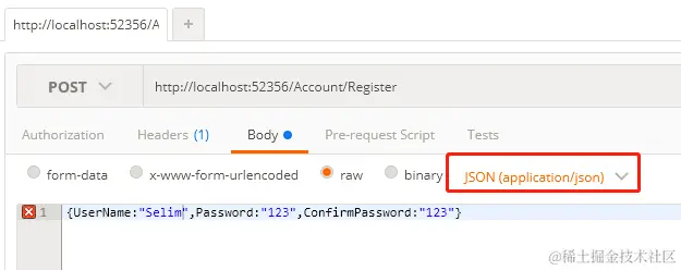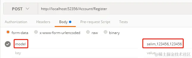 下图是发送Json格式Post请求的状态,ValueProvider中多了一个用来获取Json数据的字典值提供器: