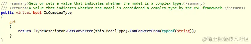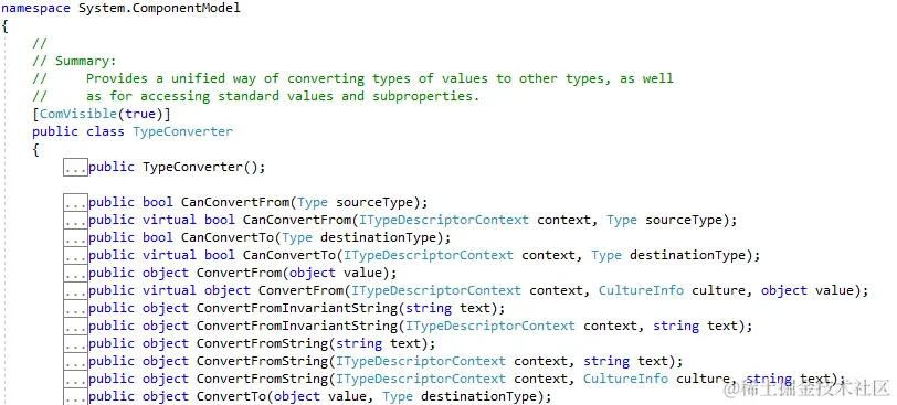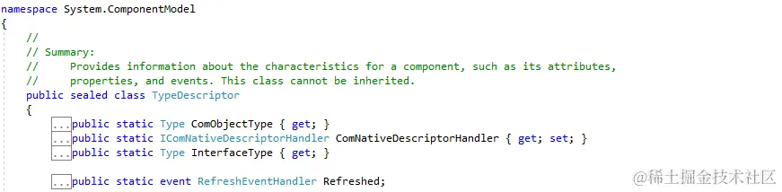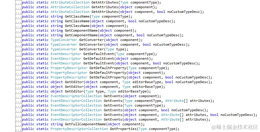 1. 通过当前模型类型来获取一个转换器(注:TypeDescriptor是一个用来获取类型相关信息的类型,如特性、属性、事件等,当然也包括类型转换器,下图是TypeDescriptor部分定义)。