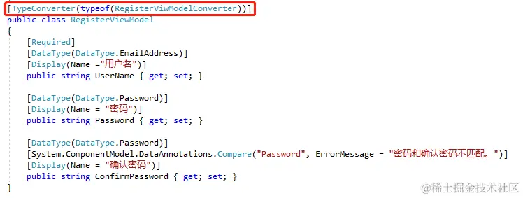 2、使用TypeConverter特性在RegisterViewModel类型上使用该转换器: