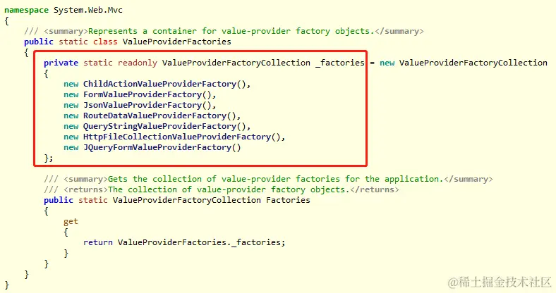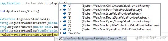 所有的提供器工厂在MVC中被一个名为ValueProviderFactories的类型维护,该类型以硬编码的方式维护了一个静态、只读的提供器工厂列表: