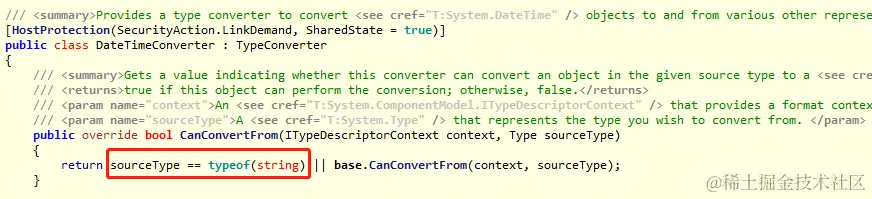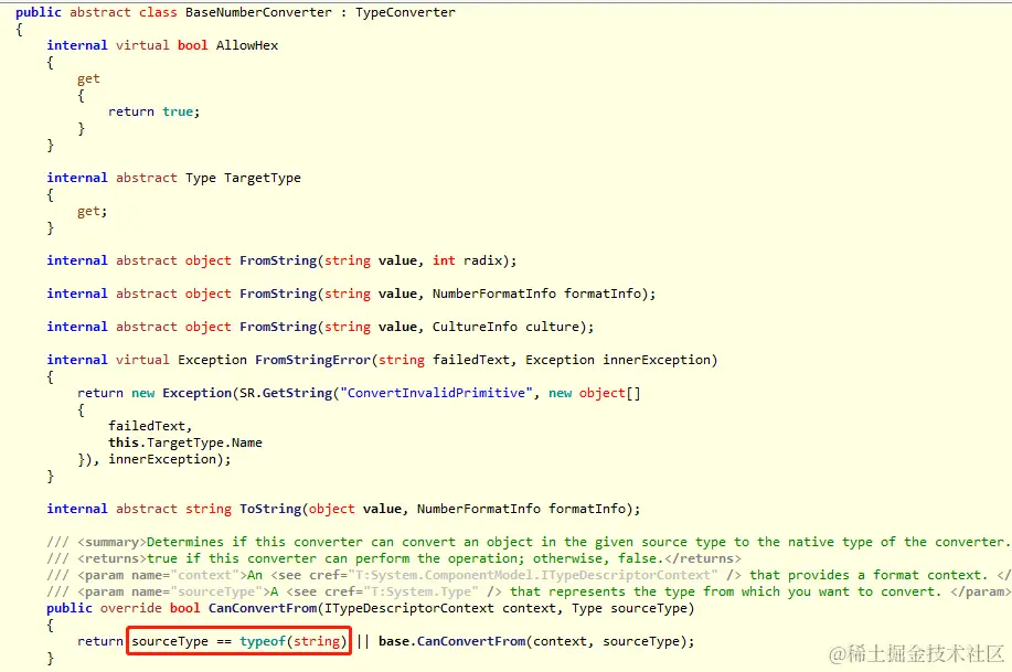 ● 数字:下图是数字转换器的基类,它的CanConvertFrom方法的实现直接硬编码了能够从string类型转换数字类型(不同数字类型有具体的实现,这里不再介绍)。