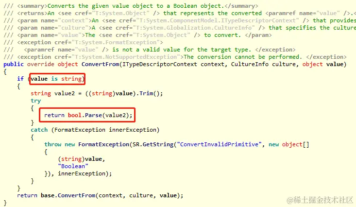 为什么说“理所当然”?因为在实际的开发中某action需要一个时间参数,那么在表单中填写或者通过一些js组件选择一个日期,然后提交到服务器这个填写的时间“就是”一个时间类型,填写的数字也就是数字类型,一切都是理所当然的。但是打着没有“魔法”的目的,需要知道的是,哪怕最简单的布尔类型实际上也进行了转换工作,下图就是Boolean转换器的转换代码: