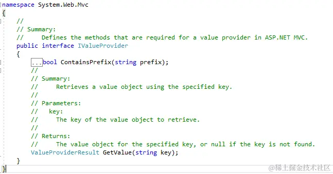 在前面的文章中介绍了ASP.NET MVC的模型绑定可以从Form Data、Query String以及Route Data等数据源中获取数据,其原因是针对每一个数据源都有一个专门的数据提供器来获取数据源的数据,在ASP.NET MVC中存在一个定义值提供器的接口IValueProvider: