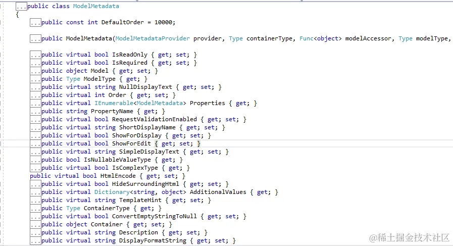 Metadata译为元数据,是一种描述数据的数据,而这里加上了Model,那么就是说描述Model数据的数据,下图为ASP.NET MVC中的一个Model定义: