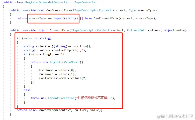 1、创建一个RegisterViewModel的转换器,继承TypeConverter类型并重载CanConvertFrom及ConvertFrom方法即可: