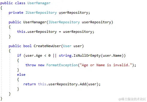上面代码中UserManager依赖一个用户的仓储类型,该仓储将会与数据库交互。