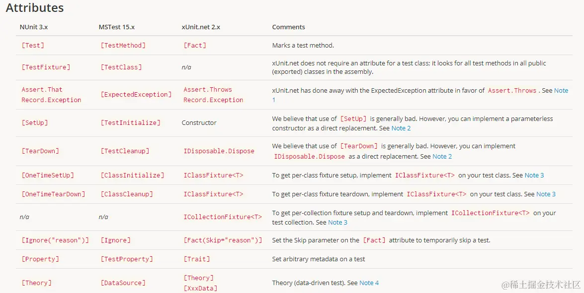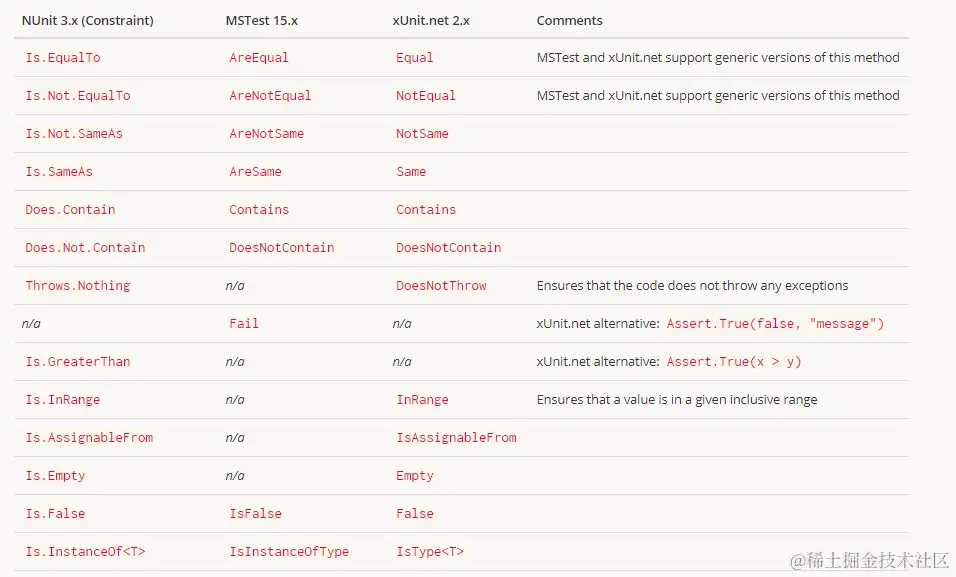 这三个框架中MSTest是与VS集成的,而NUnit和xUnit.net都加入了.Net基金会,下面两个图分别是三个框架特性和断言的比较(内容来自:xunit.github.io/docs/compar…):