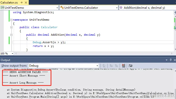 在程序中,断言指的是一个表达式语句执行时总是为真(True),它有助于代码阅读、调试、编译和缺陷检测,当断言内表达式执行为True时,不会执行任何操作,当结果为false时将会输出一些异常信息,下图是.Net中System.Diagnositics命名空间下提供的代码调试使用的断言用法(在调试程序时,当参数x < y就会中断并抛出异常信息):