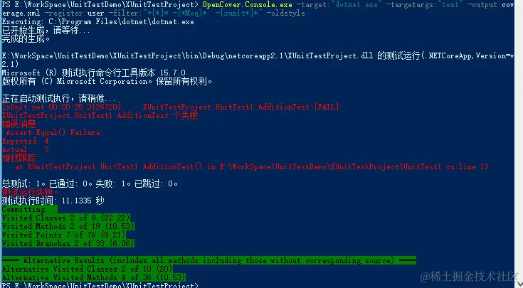 在本例中,仅需要指定目标程序是dotnet.exe,目标程序参数是test(注:.Net Core的测试功能实际上是用.Net Core的CLI命令 dotnet test完成的),另外指定输出文件名,register参数用于注册代码分析器默认使用user即可,-filter参数用于过滤不需要分析覆盖率的程序集和类型,-oldstyle是为了支持.Net Core程序添加的参数(详见:github.com/OpenCover/o…)