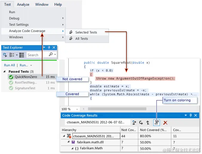 而.Net Core中如何在测试时计算代码覆盖率呢?如果使用VS的企业版,那么VS自带了代码覆盖率分析工具: