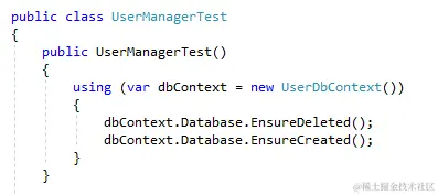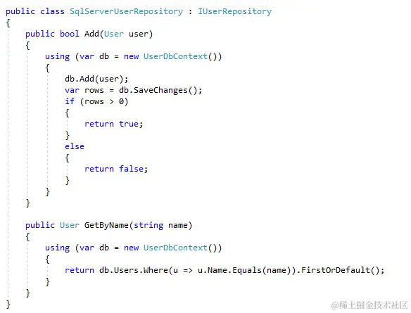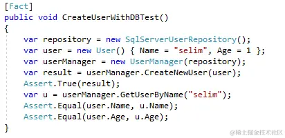 测试代码也非常简单,就是创建一个SQLServer的用户仓储实例,然后通过构造的方式将其注入到UserManager类型中使用,后续UserManager的创建、查询用户的方法将通过该仓储实现。