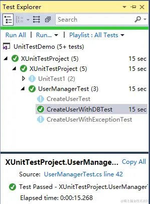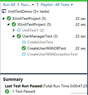 注:在共享测试上下数据时(包括共享数据库数据),可能会因为测试方法执行顺序导致测试失败,但是xUnit.Net中没有提供按顺序执行实现方式,默认是按照方法命名,如果需要按照一定顺序执行测试,可参考官方的例子:github.com/xunit/sampl…