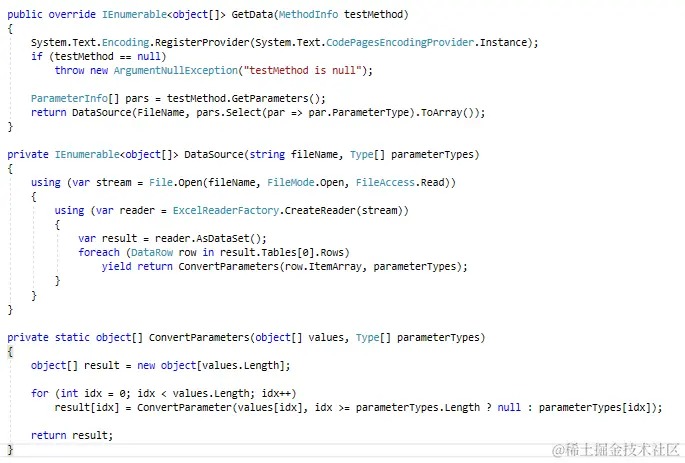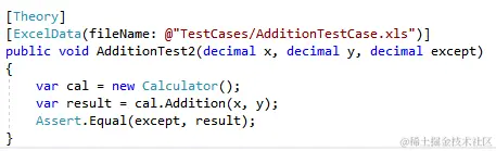 xUnit.Net没有提供内置的Excel数据加载功能,但是它的拓展性很好,可以通过实现DataAttribute实现一个Theory的数据源提供器:
