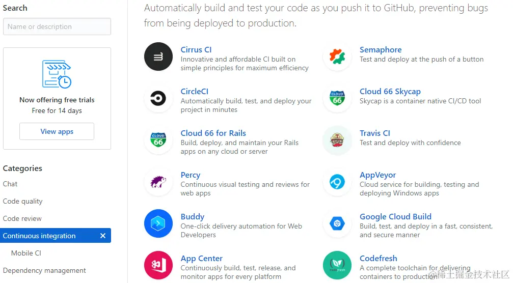 GitHub作为一个分布式的软件管理解决方案,它除了提供代码托管外,还通过应用市场的方式提供了拓展应用,这些应用主要用于持续继承、部署、测试、代码审查、项目管理等等,详情查看:github.com/marketplace…