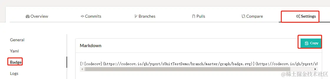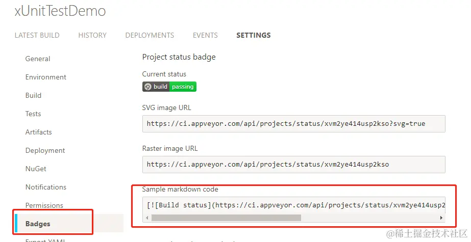 Appveyor的Badges(标记)配置界面中可以获取到状态标记地址: