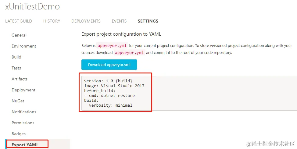 上面的方法是通过Appveyor的Web界面上完成配置的,除此之外还可以通过appveyor.yml文件来完成配置,appveyor.yml文件可以自己创建或导出已有配置: