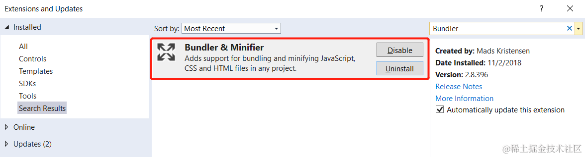 另外对于css及js资源文件的打包、压缩功能,最新版本(ASP.NET Core 2.1)的应用模板以及不会自动添加相关功能,需要在拓展工具中添加Bunlder& Minifier拓展: