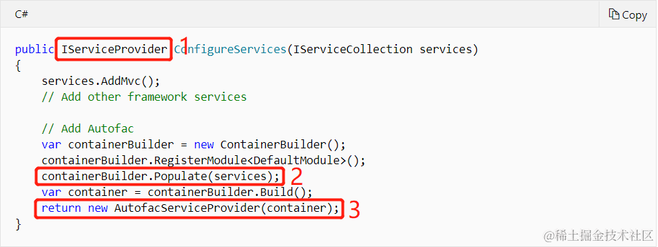 1. 将ConfigureServices方法的返回类型改为IServiceProvider。