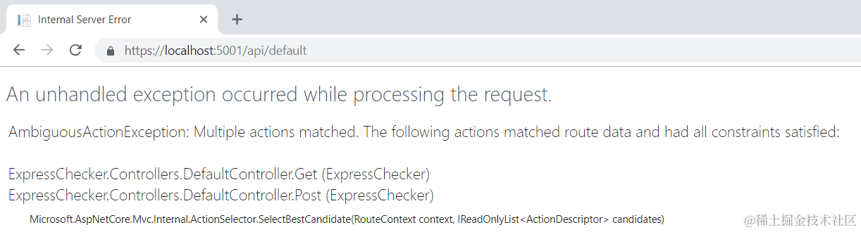 但要注意的是在ASP.NET Core中实现的REST风格的Controller,它不会再根据action方法的名称来匹配谓词,所以存在多个方法时会,那怕对方法进行了命名,但仍然会出现以下错误: