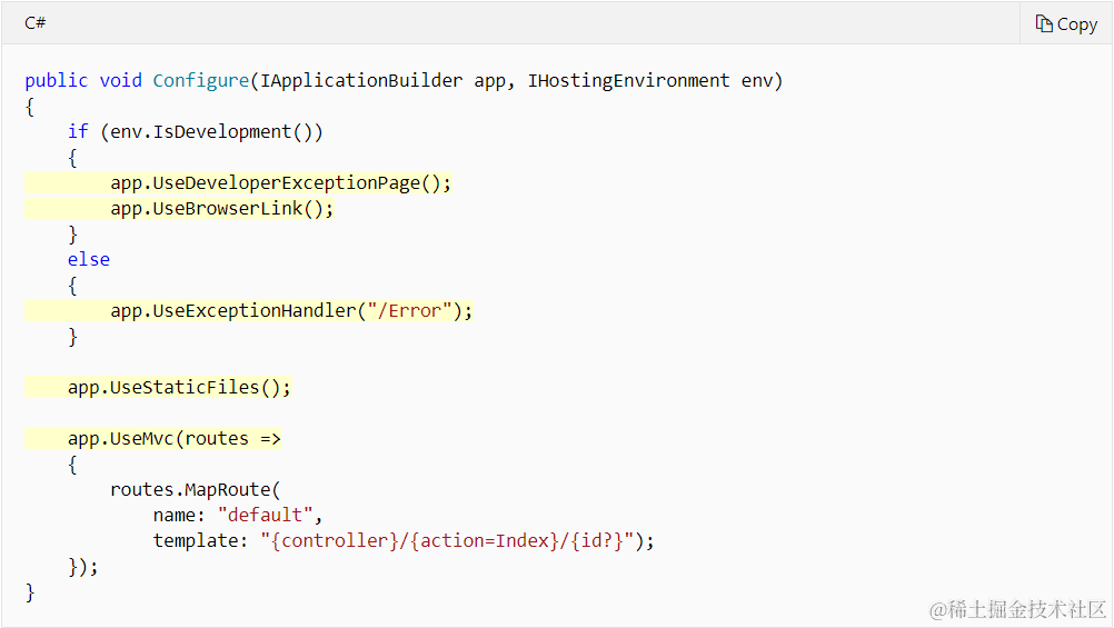 ASP.NET由于是基于IIS请求管道的,ASP.NET应用程序仅仅是管道中的一个处理环节,管道中还包含如身份验证、静态文件处理等环节,但ASP.NET Core不一样,它脱离了IIS处理管道,所以整个管道的建立均需要靠程序自身完成,而ASP.NET Core建立管道的代码就是Startup类型的Configure方法,该方法通过IApplicationBuilder实例来添加不同功能的中间件,通过中间件的串联形成处理管道,下图是ASP.NET Mvc模板生成的管道代码: