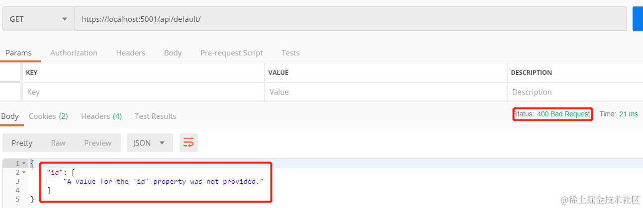 注:当请求参数为简单类型时,请求体内容类型需要为application/json,内容不能为Json字符串,使用参数值作为内容即可(上图id没有提供的异常并不是因为Json格式问题,而是没有指明从body中获取数据导致的)。