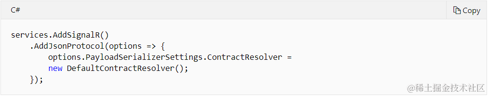 5. SignalR默认使用Json协议传输数据,默认情况下使用首字母小写的驼峰命名方式序列化对象,要更改该默认行为需要通过一下代码,替换默认的序列化行为: