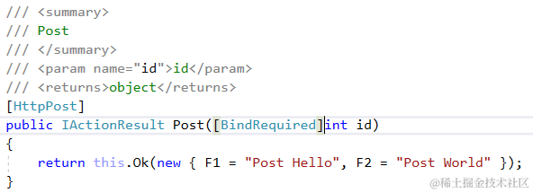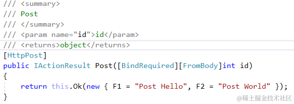 1. FromBody用于复杂类型推断,如果不是复杂类型(如int、string等)以及特殊的内置类型(IFormCollection文档例子),则不会从Body中获取数据,除非通过[FromBody]特性指明,例子如下: