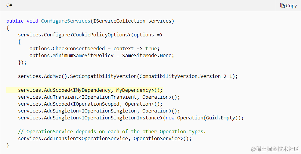 3. 在Action方法或者Mvc过滤器(过滤器的上下文参数中包含HttpContext)中通过HttpContext的RequestServices对象获取服务: