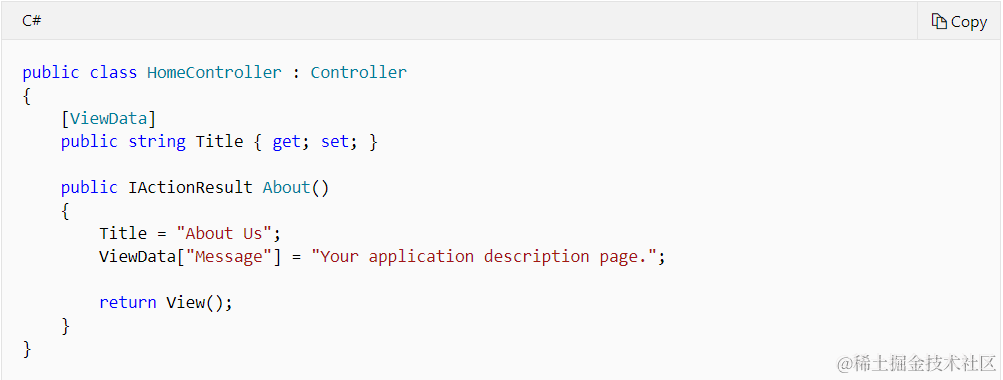 2. Controller将参数传输到View的方法添加了ViewData特性,使用方法如下: