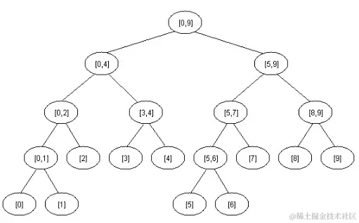 下面是区间 [0, 9] 的一个线段树: