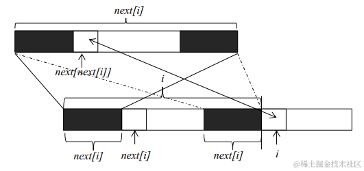 理解了kmp算法的基本原理,下一步就是要获得字符串f每一个位置的最大公共长度。这个最大公共长度在算法导论里面被记为next数组。在这里要注意一点,next数组表示的是长度,下标从1开始;但是在遍历原字符串时,下标还是从0开始。假设我们现在已经求得next[1]、next[2]、……next[i],分别表示长度为1到i的字符串的前缀和后缀最大公共长度,现在要求next[i+1]。由上图我们可以看到,如果位置i和位置next[i]处的两个字符相同(下标从零开始),则next[i+1]等于next[i]加1。如果两个位置的字符不相同,我们可以将长度为next[i]的字符串继续分割,获得其最大公共长度next[next[i]],然后再和位置i的字符比较。这是因为长度为next[i]前缀和后缀都可以分割成上部的构造,如果位置next[next[i]]和位置i的字符相同,则next[i+1]就等于next[next[i]]加1。如果不相等,就可以继续分割长度为next[next[i]]的字符串,直到字符串长度为0为止。由此我们可以写出求next数组的代码(Java版):
