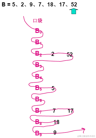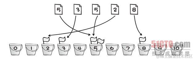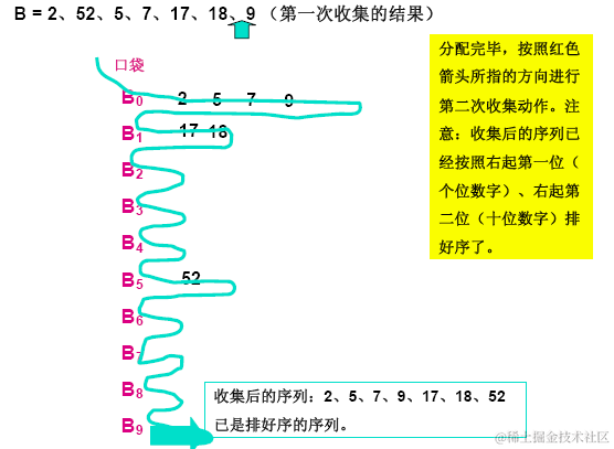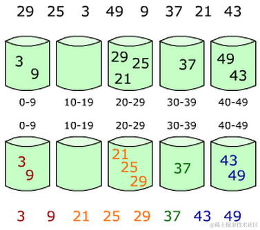 按照顺序遍历这些buckets并放回到原始数组中即可构成排序后的数组。图示