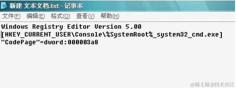 3、 新建文本,复制粘贴以下代码,把文件类型改成reg :Windows Registry Editor Version 5.00 [HKEY_CURRENT_USER\Console\%SystemRoot%_system32_cmd.exe] "CodePage"=dword:000003a8
