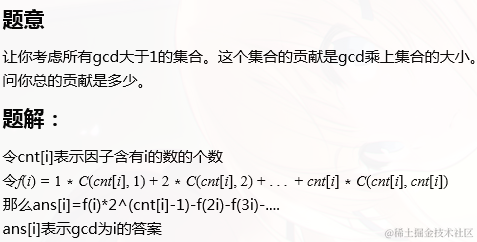 He has created a method to know how strong his army is. Let the i-th soldier’s strength be a**i. For some k he calls i1, i2, ..., i**k a clan if i1 < i2 < i3 < ... < i**k and gcd(a**i1, a**i2, ..., aik) > 1 . He calls the strength of that clan k·gcd(a**i1, a**i2, ..., aik). Then he defines the strength of his army by the sum of strengths of all possible clans.
