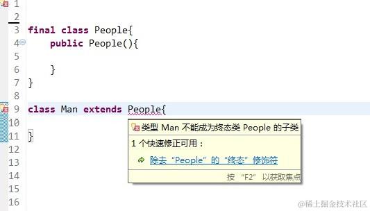 当用final修饰一个类时,表明这个类不能被继承。也就是说,如果一个类你永远不会让他被继承,就可以用final进行修饰。final类中的成员变量可以根据需要设为final,但是要注意final类中的所有成员方法都会被隐式地指定为final方法。