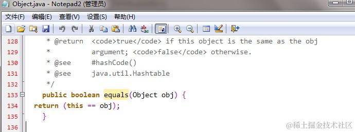 equals方法是基类Object中的方法,因此对于所有的继承于Object的类都会有该方法。为了更直观地理解equals方法的作用,直接看Object类中equals方法的实现。