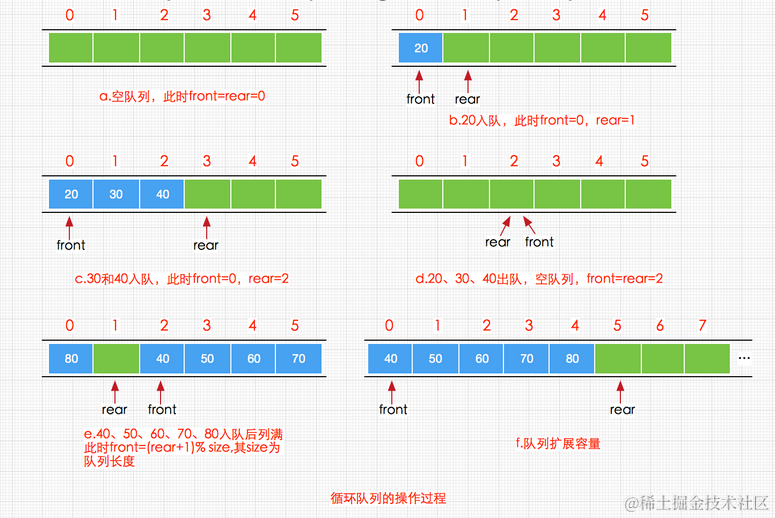 出队操作改变front下标指向,入队操作改变rear下标指向,size代表队列容量。