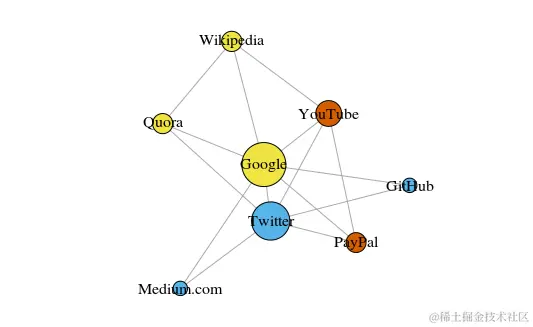 这些顶点的颜色表示了它们的团体关系,大小是根据它们的中心度(centrality)确定的。可以看到谷歌和 Twitter 是最中心的吧?
