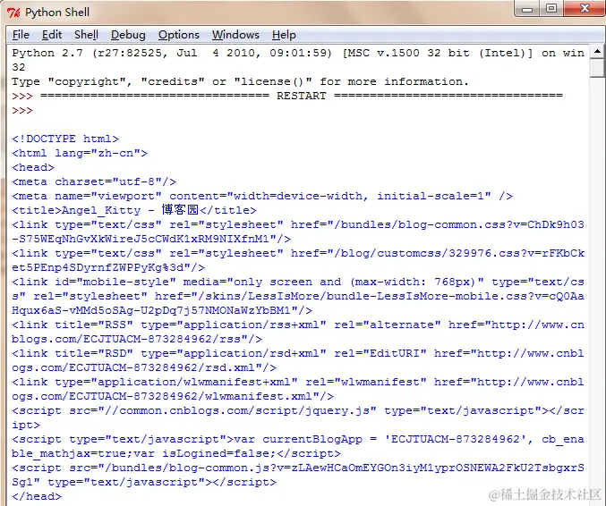 说了这么多,先来感受下一个爬虫吧,这里我们直接抓取一个网页例如:www.cnblogs.com/ECJTUACM-87…