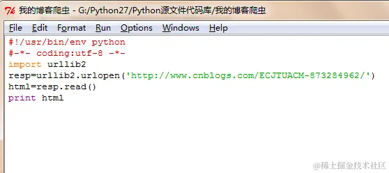 这个网页是我的官方博客,我们要将其内容抓取下来,其实只需要两句代码就能完成,需要使用urllib2库,代码如下: