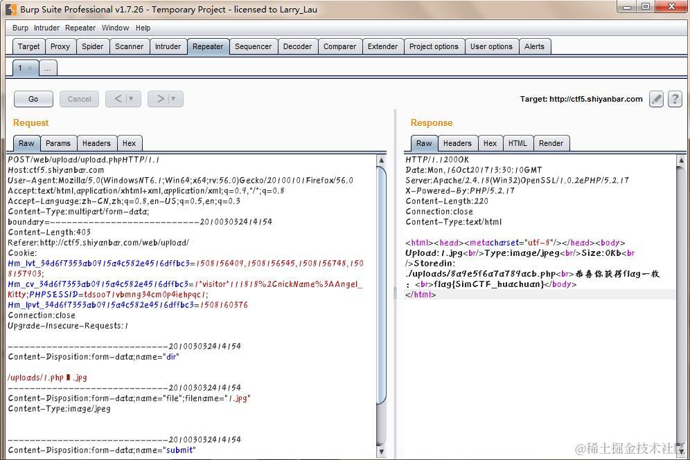 然后我们开启Intercept,点击文件上传,这时我们会发现页面没有跳转,说明这个包已经被我们拦截下来了,然后我们再把这个包发送到Repeater里面去,对这个包进行一个分析,然后这时我们可以用到00截断,自己手动构造一个上传的文件,1.php .jpg,然后我们去Hex查看,发现只需要把20改为00,再回到Raw,发现空格已经变成一个框框,框框表示一个空字节,这时我们只需要Go一下,发送文件过去,然后我们可以看到如下界面: