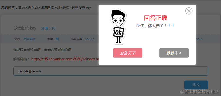 这是我入门密码学开始写的第一道题,题目标题为这里没有key,真的没有key嘛,没有key干嘛要你写呢?于是点开解题链接,弹出一个对话框,对话框显示了"这里没有key"的字样,点击确定,咦,还真的什么都没有诶,这个该怎么办呢?
