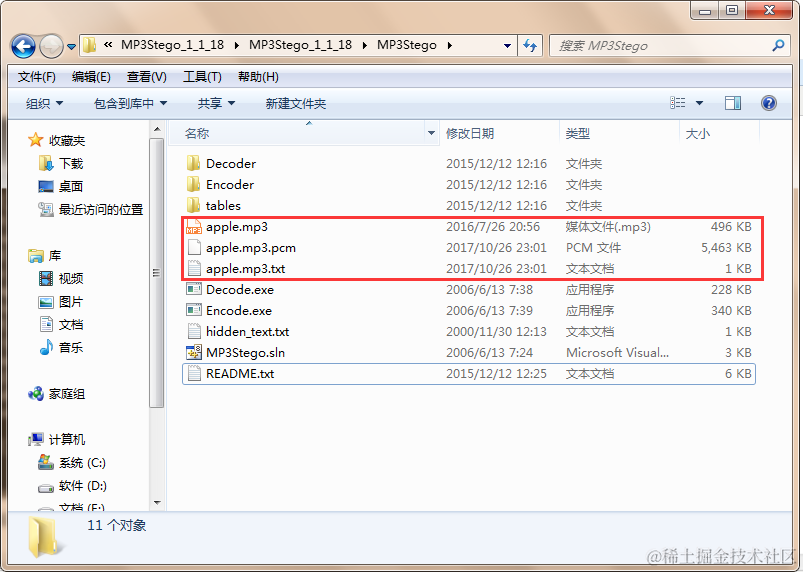 打开这个压缩包,发现这个压缩包里面有个apple.mp3,我们看到mp3的时候,也要想到这是一个隐写工具